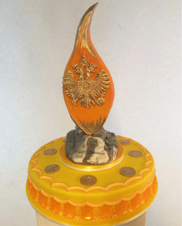 Die kalte Schokocreme aus der Form lösen und auf eine Platte stürzen oder die Masse mit Marzipan überziehen und verzieren – eine Flame of Peace Torte, A Peace Cake. Gekühlt in Scheiben schneiden und servieren.