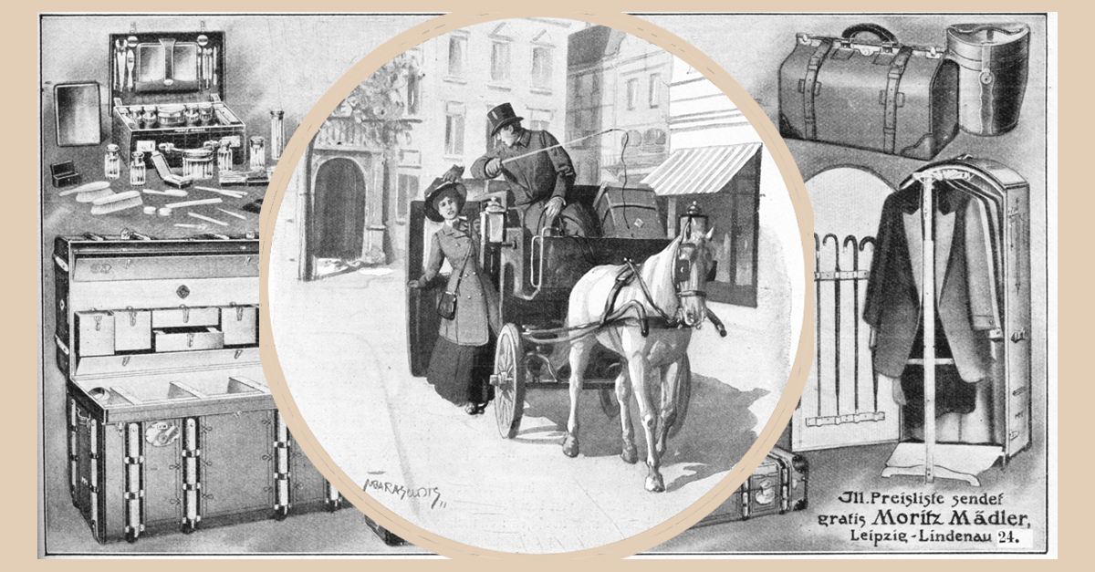 Und für die Dame? Gehörte neben dem Reisekoffer für die Kleider und Unterwäsche ein Hutkoffer unbedingt zur Reiseausstattung. Denn zu jeder Garderobe trug man Hut! Die Kofferfabrikanten, wie z.B. Moritz Mädler aus Leipzig, wussten die Bedürfnisse ihrer Kunden zu befriedigen und boten z.B. einen patentierten Damenhut-Koffer an, „welcher Damenhüte auf Reisen vor Druck schützt“ und in dem vor allem mehrere Hüte verstaut werden konnten und zwar „mit Schubriegelschloss, 1 Einsatz, polierten Holzreifen, Schlossschützern und 6 ges.(etzlich) gesch(ützten) Huthaltern. Der Koffer zeichnet sich besonders durch Leichtigkeit, Eleganz und Haltbarkeit aus!“ Hutkoffer für Herren gab es gleichfalls, denn auch sie waren behütet unterwegs!