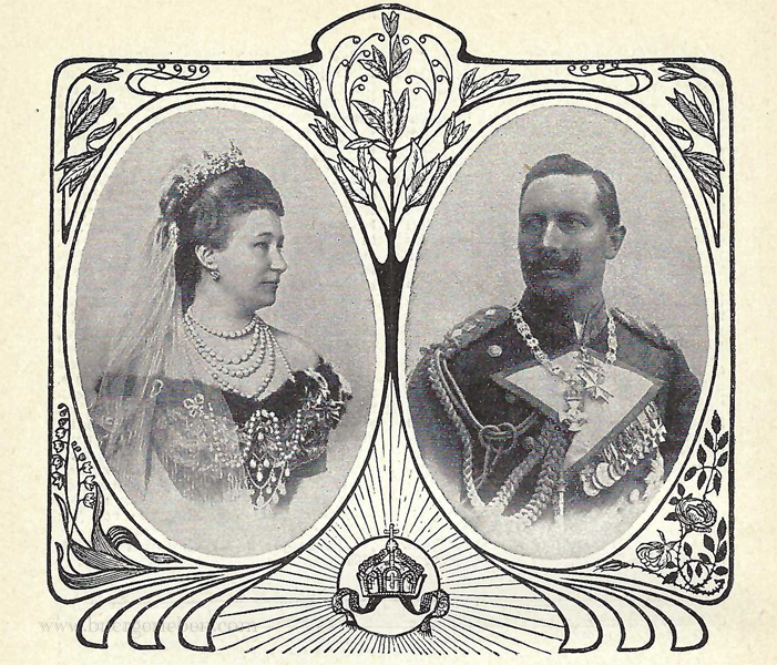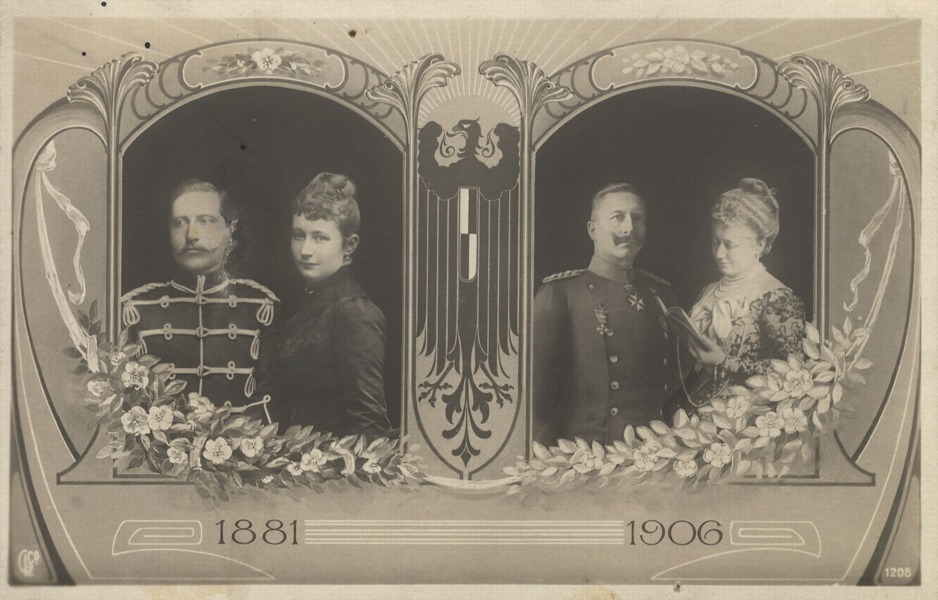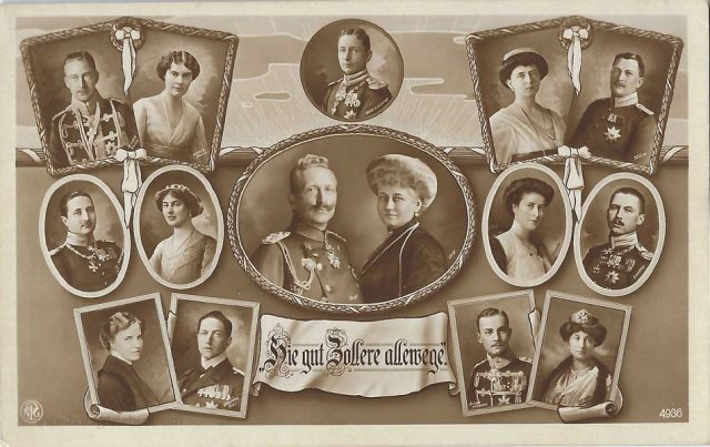 Ahnentafel der Hohenzollern, von li oben nach rechts unten: Kronprinz Friedrich Wilhelm und Frau Cecilie, Prinz Wilhelm Eitel Friedrich und Frau Sophie Charlotte, Prinz Adalbert und Frau Adelheid, Mitte Kaiserpaar, darüber Prinz Joachim, re oben nach unten: Prinz August Wilhelm und Frau Alexandra Victoria, Prinz Oskar und Frau Ina Maria, Prinzessin Viktoria Luise und Mann Ernst August