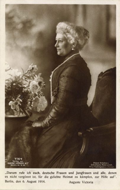 Dona präsentierte sich als leidenschaftliche Patriotin: „Darum rufe ich euch, deutsche Jungfrauen und alle…zur Hilfe auf“, heißt es in einem Appell vom 6. August 1914. „Es trage jeder nach seinen Kräften dazu bei, unseren Gatten, Söhnen und Brüdern den Kampf leichtzumachen. Ich weiß, dass in allen Kreisen unseres Volkes ausnahmsweise der Wille besteht, diese hohe Pflicht zu erfüllen…Auguste Viktoria.“