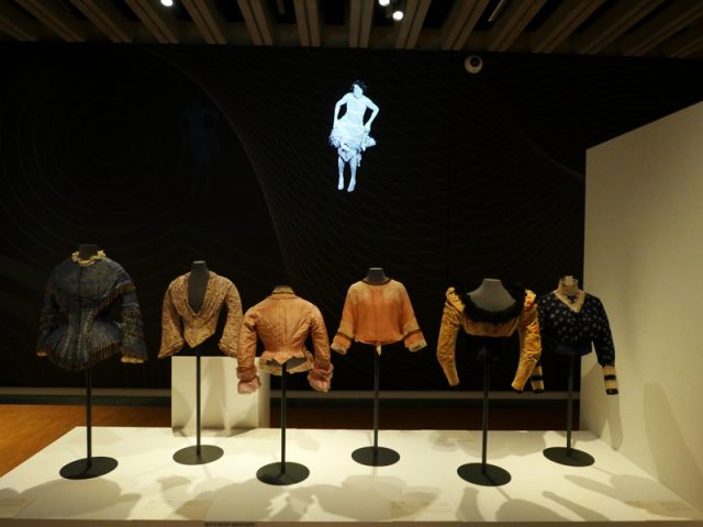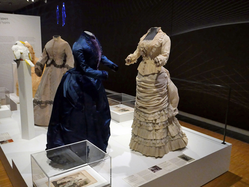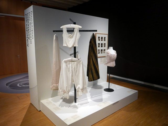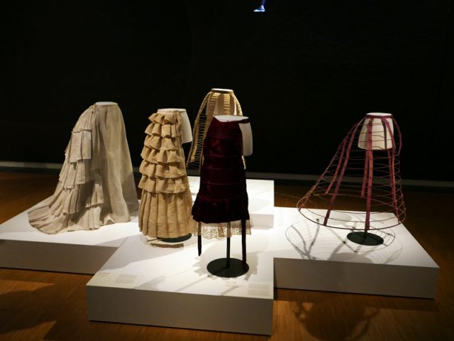 Besonders stark sind Modelle vom letzten Drittel des 19. Jahrhunderts vertreten – die Röcke waren weit ausladend und über dem Po erhöht. Wie die Frauen diese Silhouetten erreichten? Durch entsprechende Unterkleidung. Auch diese ist in der Ausstellung zu sehen, von der Krinoline bis zur Tournüre. Sie waren praktischer und leichter als viele Unterröcke, die gleichfalls zu einem „Bausch-Effekt“ führten. Ob Tournüre oder Unterröcke – es war schwierig, sich dieses Ornats für gewisse Bedürfnisse zu entledigen. So waren die Unterhosen meist unten offen, damit war der Toilettengang leichter zu erledigen. Wie es mit der Monatshygiene gehandhabt wurde, könnt Ihr in diesem Artikel nachlesen.