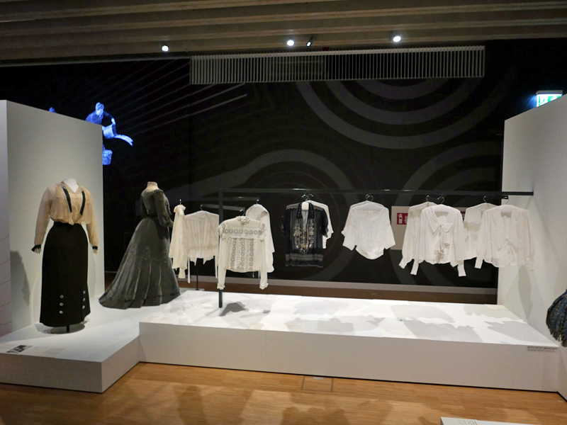 Überhaupt – so schön die Frauen in ihren Kleidern mit passenden Hüten aussahen, verdeutlicht die Ausstellung, wie eingegrenzt der Bewegungsspielraum der Frauen bis in die Anfangsjahre des 20. Jahrhunderts war. Ich selbst trage ja zu Auftritten meist ein Kostüm, die Modellen dieser Zeit nachempfunden sind (allerdings ohne Korsett). Es ist ein schönes Gefühl, so unterwegs zu sein, aber man muss auf so viel mehr achten – ob nun Treppen (Stolpern!), Fahrstühltüren (Rockeinklemm-Gefahr) oder den Boden (Schmutz!). Okay, das Problem mit dem Fahrstuhl können wir für die damalige Zeit vernachlässigen.
