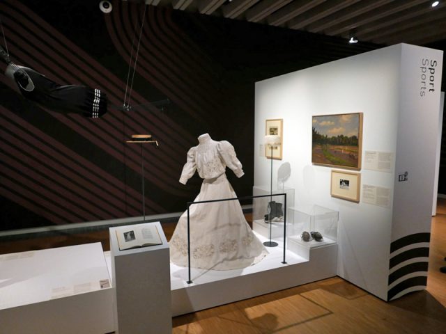 Ein langer Rock war allerdings auf dem Fahrrad sehr unpraktisch! Was tun? Man erfand einen Rock, unter dem weite Hosen versteckt waren. Auch Pumphosen kamen auf. Das Verständnis dafür setzte jedoch erst allmählich ein – zunächst wurden Frauen, die mutig genug waren, solche neuartigen „unsittlichen“ Kleidungsstücke zu tragen, oft verhöhnt und verspottet. Auch der Badeanzug brauchte so eine ganze Zeit, um sich aus einem einteiligen Anzug mit Rüschen zur heutigen Form zu entwickeln – ein Exemplar aus den 20er Jahren, unseren heutigen gar nicht so unähnlich schwingt in der Ausstellung von der Decke. Daneben sieht man ein Tenniskostüm aus den Anfangsjahren des 20. Jahrhunderts, was traditionellen Kleidern noch sehr ähnelt – nur dass es etwas leichter ist und ohne voluminöses Unterkleid auskommt. Trotzdem möchte man so nicht Tennis spielen!