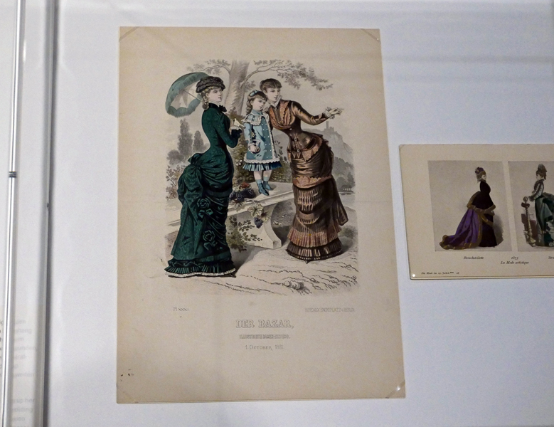Wie beides korrespondiert, zeigt die Ausstellung übrigens auch. Denn zu den gezeigten Kleidern werden Bilder mit ganz ähnlichen Kleidern aus Modezeitschriften, wie z.B. dem „Bazar“ oder der „Illustrierten Modenzeitung“ präsentiert. Sehr schön für einen plastischen Vergleich! Zu den Toiletten, heute würde man „Outfits“ sagen, gehörten auch entsprechende Accessoires – ob nun der Hut, Sonnenschirm und natürlich auch passende Schuhe. Auch diese werden ab und an dazu drapiert.