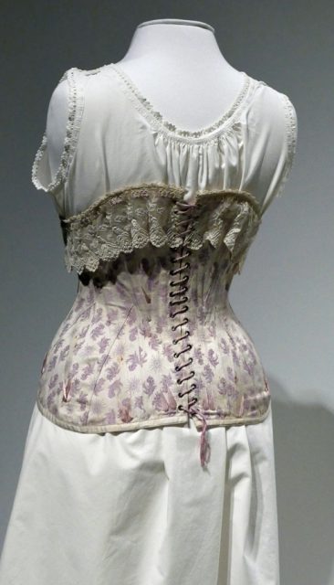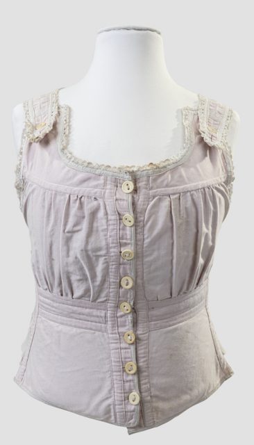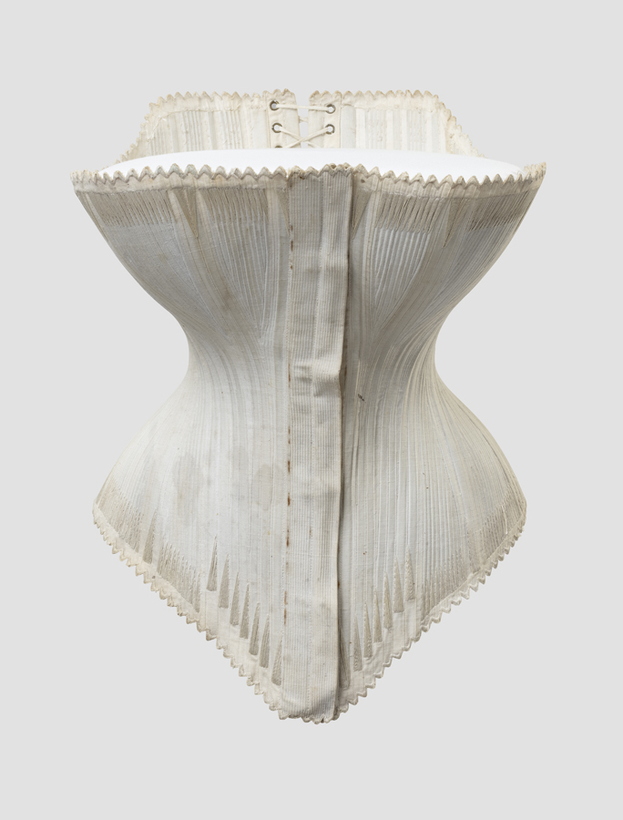 Für die obere Silhouette war das Korsett zuständig, welches für die obligatorische schmale Taille sorgte. Auch hier arbeitete frau mit mehreren Schichten, zur Schonung dieses recht teuren Kleidungsstücks (die meisten wurden für die Frauen angefertigt, erst später konnte man fabrikmäßig hergestellte Korsetts kaufen), wurde darunter ein Unterhemd getragen. Und darüber zog man eine Untertaille (oder Korsettschoner) an, die der engen Form des Korsetts angepaßt war. Für die fabrikmäßige Korsettherstellung wurden übrigens gerne Frauen eingestellt.