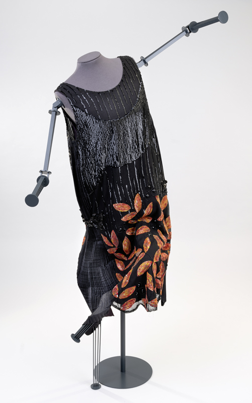 Insgesamt wird der Wandel der Kleidung gut sichtbar. Zunächst kommt die Kombination von Kleidungsstücken – zu einem Rock können mehrere Blusen gewechselt bzw. angezogen werden -in der Ausstellung mit an Bügeln hängenden Blusen symbolisiert. Nach dem 1. Weltkrieg werden die Kleider dann kürzer und die Silhouette lockerer. Kein Korsett schnürt mehr die Taille ein – man hat Bewegungsfreiheit – auch für die neuen Tänze wie Charleston und Shimmy unerläßlich! Einige schöne 20er Jahre Kleider sind zu sehen. Babylon Berlin läßt grüßen (leider nicht mit einem Filmausschnitt, der für die Ausstellung vorgesehen war – die Hauptdarstellerin war nicht einverstanden).