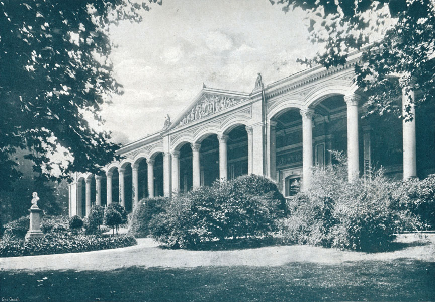 So wurde auch der Bau einer neuen Trinkhalle in nächster Nähe des Kurhauses möglich. Das geschah auch, um den Kurcharakter der Stadt nicht ganz zu vernachlässigen: Man musste schließlich einen offiziellen Grund für den vergnüglichen Aufenthalt haben! Sie wurde von 1839 bis 1842 erbaut – übrigens von einem Schüler Weinbrenners, Heinrich Hübsch. In dem im Stil der Spätromantik errichteten Bau konnte man im Brunnenraum das Thermalwasser holen, danach mit seinem Becher in den Kolonaden wandeln und sich die vierzehn gemalten Bilder (von J. Götzenberger) mit Sagen aus der Umgebung anschauen.