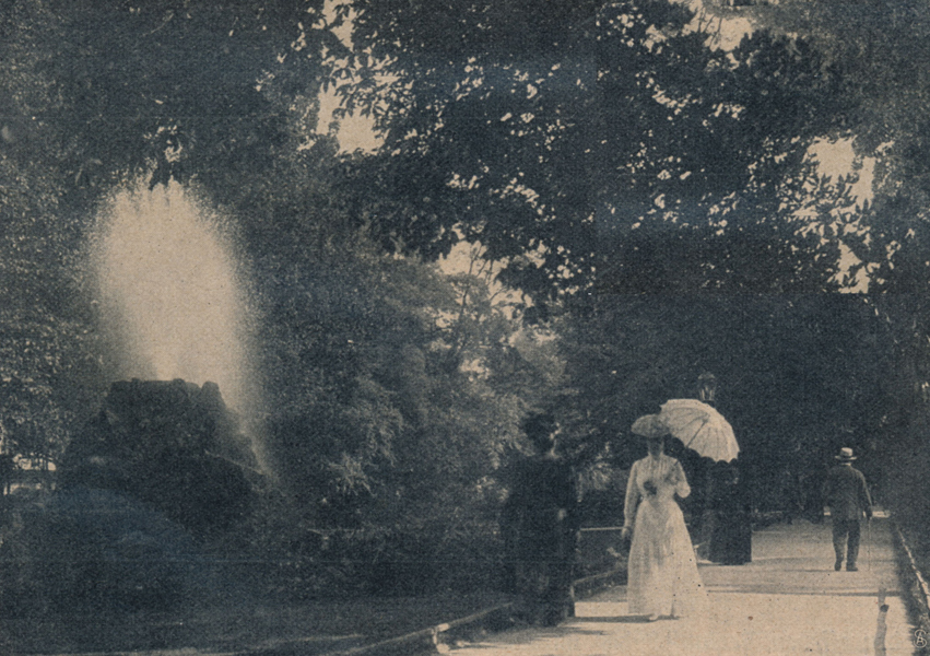 Bevor man abends die Qual der Wahl zwischen Konzert-, Theaterbesuch oder vielleicht einem Ballbesuch hatte, konnte man am Nachmittag gerne einmal einen Ausflug in die nähere oder fernere Umgebung unternehmen, 1909 dann nicht nur per Droschke, sondern auch per Automobil, wie man sieht (im Reiseführer als Motorwagen bezeichnet).