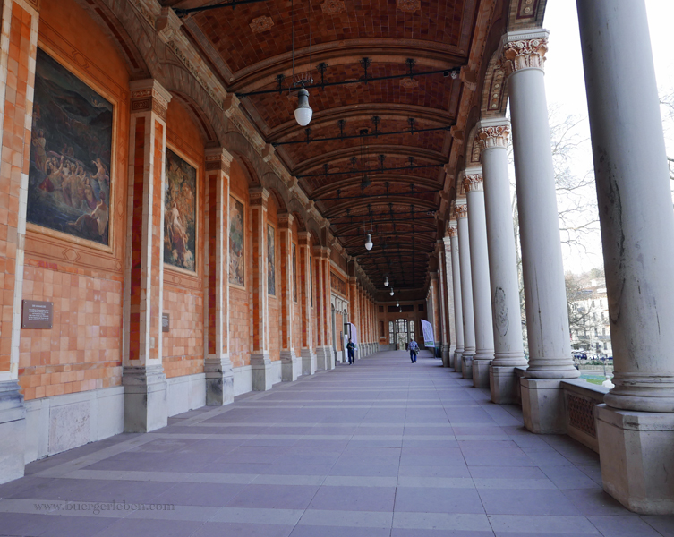 So wurde auch der Bau einer neuen Trinkhalle in nächster Nähe des Kurhauses möglich. Das geschah auch, um den Kurcharakter der Stadt nicht ganz zu vernachlässigen: Man musste schließlich einen offiziellen Grund für den vergnüglichen Aufenthalt haben! Sie wurde von 1839 bis 1842 erbaut – übrigens von einem Schüler Weinbrenners, Heinrich Hübsch. In dem im Stil der Spätromantik errichteten Bau konnte man im Brunnenraum das Thermalwasser holen, danach mit seinem Becher in den Kolonaden wandeln und sich die vierzehn gemalten Bilder (von J. Götzenberger) mit Sagen aus der Umgebung anschauen.