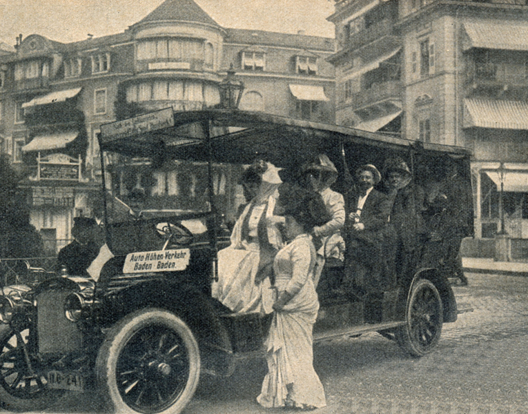 Bevor man abends die Qual der Wahl zwischen Konzert-, Theaterbesuch oder vielleicht einem Ballbesuch hatte, konnte man am Nachmittag gerne einmal einen Ausflug in die nähere oder fernere Umgebung unternehmen, 1909 dann nicht nur per Droschke, sondern auch per Automobil, wie man sieht (im Reiseführer als Motorwagen bezeichnet).