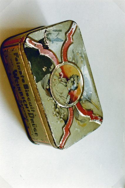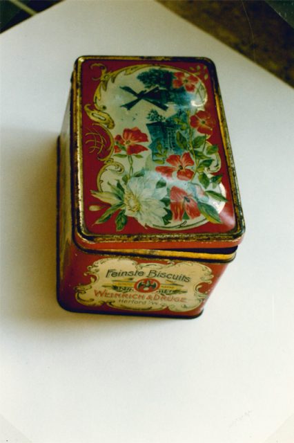 Oft wurden diese in schön gestalteten Blechdosen angeboten – in jedem Fall die besseren Qualitäten. Und zu diesen wollte die „Cakesfabrik Weinrich & Drüge“ mit ihrem Gebäckprodukten gehören. Die Dosen, in der die Kekse, Waffeln, Biscuits und Lebkuchen verkauft werden, sind aufwendig gestaltet – mit Landschaftsmotiven, Frauendarstellungen und Elementen des Jugendstils verziert – wie hier zu sehen ist.