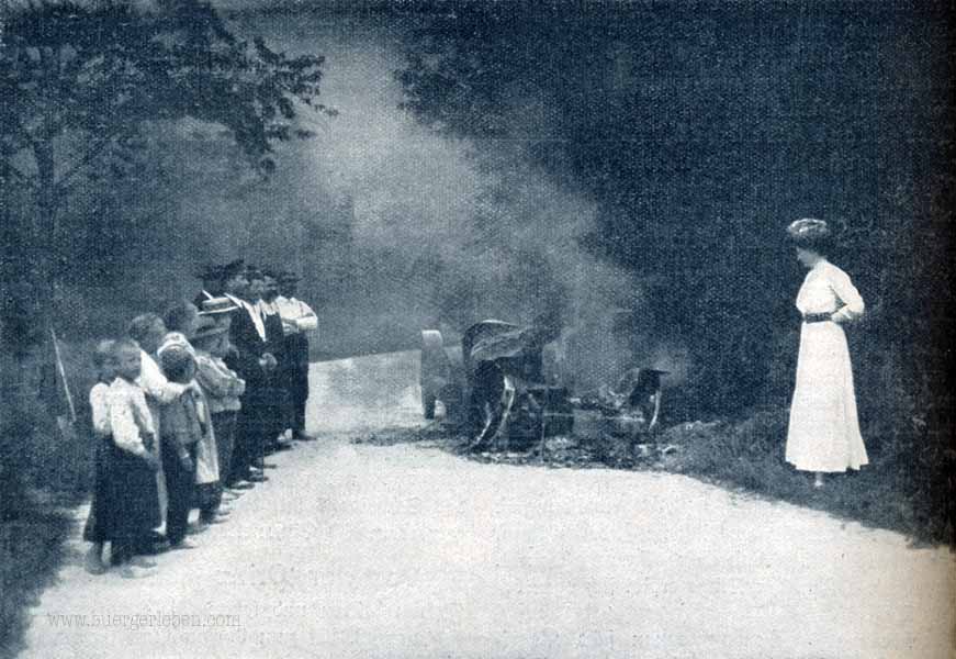 „Leider kamen während der Fahrt auch mehrere bedauerliche Unfälle vor; einen, der noch recht glimpflich für die Insassen ablief, zeigt unsere Abbildung. Der Benzinbehälter eines Automobils wurde leck und fing Feuer; in wenigen Minuten war das schöne, teure Fahrzeug ein Raub der Flammen geworden.“