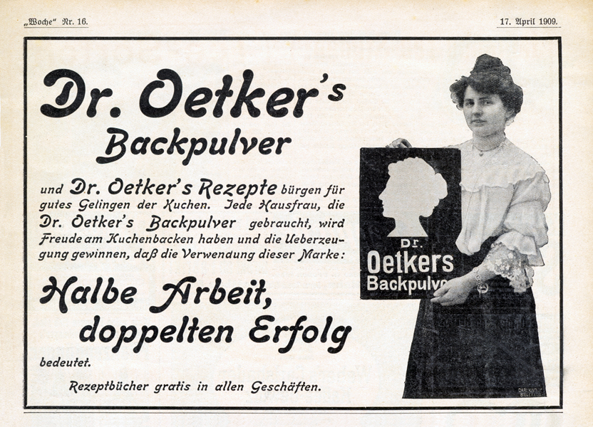 Er schaltete zahlreiche Werbungen in Zeitschriften, z.B. in „Die Woche“. Hier transportiert er seine Botschaften: Mit Dr. Oetker-Produkten backen ist so leicht, dass es selbst Kindern gelingt. Weiterhin fällt der der öfter verwendete Zusatz „Institut für Küchenchemie“ in den Werbungen auf. Ob das heute für höhere Umsätze sorgen würde? Wahrscheinlich eher nicht, suggeriert es doch ein künstlich erschaffenes Produkt, wo wieder Natürlichkeit ohne Zusatzstoffe gefragt ist.