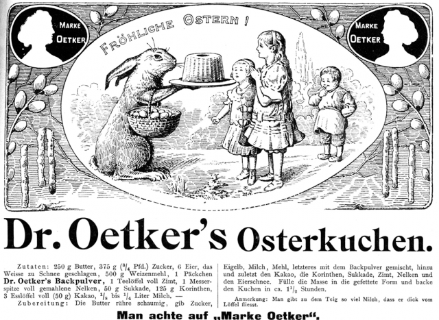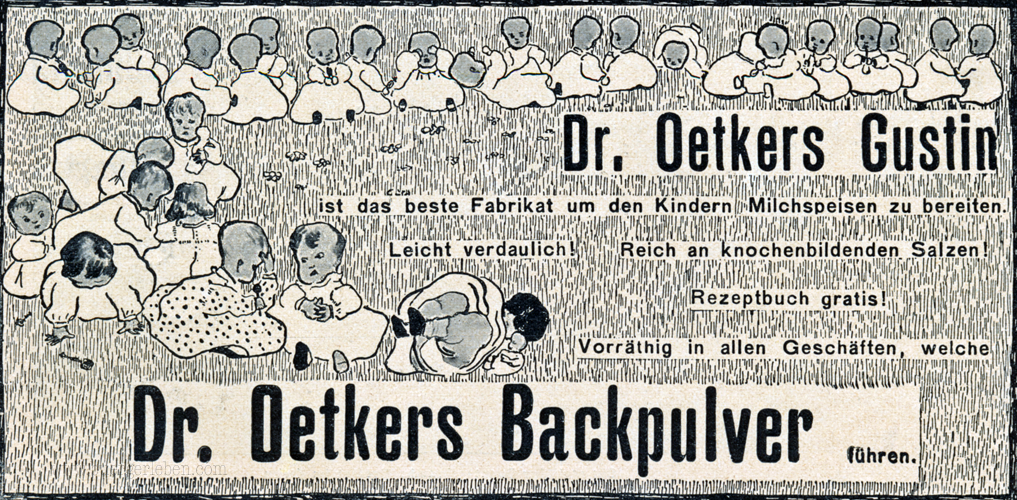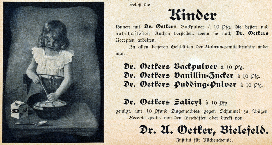 Wenn ich in den alten Zeitschriften die Seiten mit Werbungen durchblättere, stoße ich auf viele Firmennamen und Marken, die heute längst vergessen sind. Umso mehr freut es mich immer, wenn ich eine Marke entdecke, die heute noch einen klangvollen Namen hat: z.B. Dr. Oetker! Heute setzt das Unternehmen jährlich Milliarden um und ihr Sortiment umfasst viele weitere Produkte, ob nun Pizza oder Müsli.