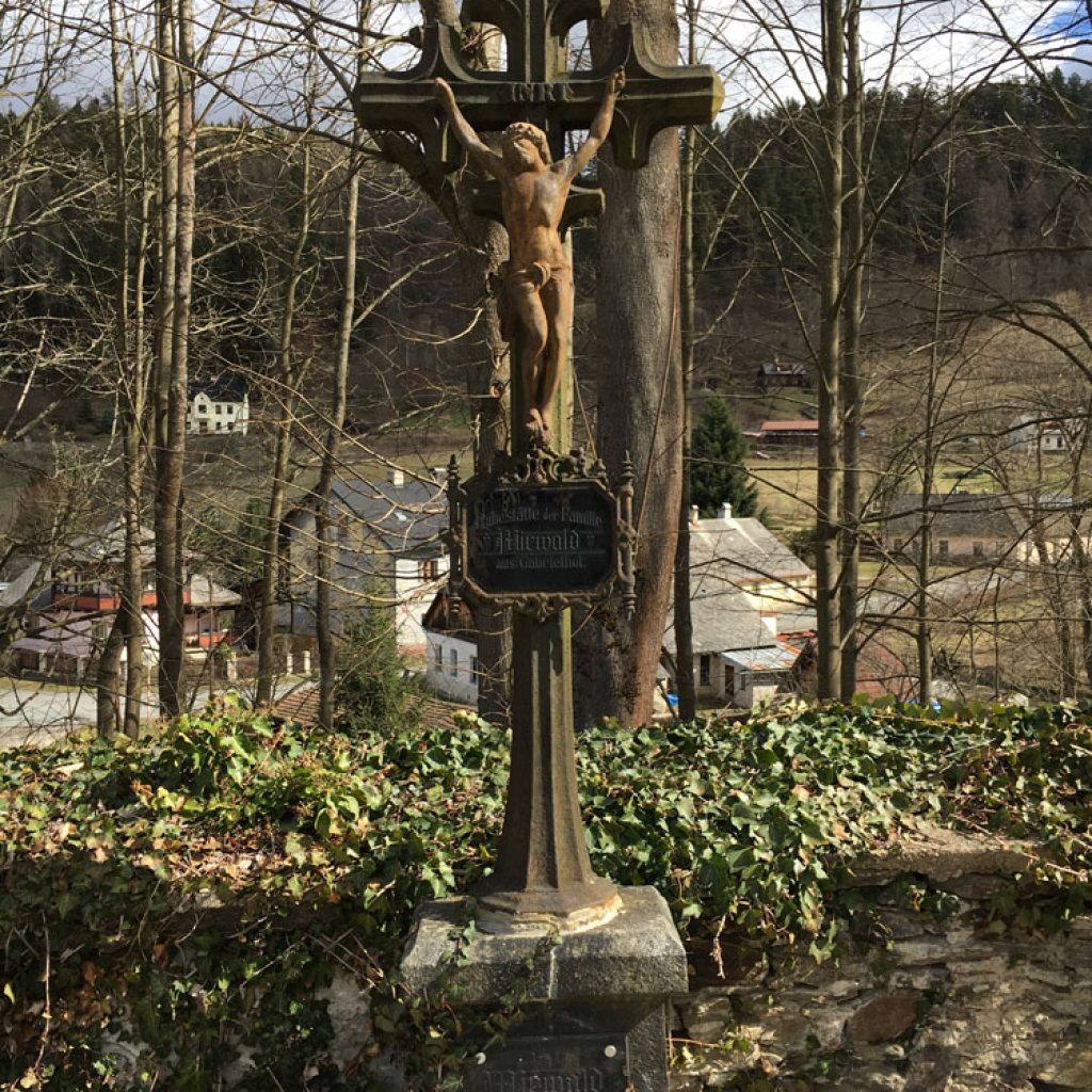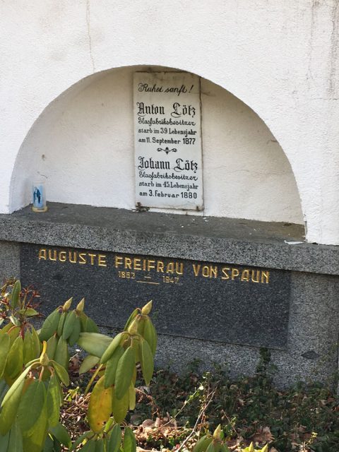 Der Ort war übrigens für seine Glasfabrikation berühmt, die Firma Lötz gab es bis zum Ende des 2. Weltkriegs. Übrig davon ist noch die schöne Jugendstilvilla des Fabrikanten, die man sich von außen anschauen kann – sie ist jedoch bis heute noch bewohnt, wenn auch nicht mehr von der Fabrikantenfamilie. Auch sie hat übrigens ein Familiengrab auf dem Friedhof.