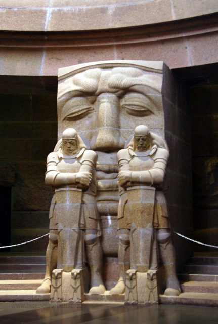 Ein weiteres Stockwerk höher ist die Krypta, die das symbolische Grab der Gefallenen darstellt, bewacht von acht Zweiergruppen steinerner Krieger.