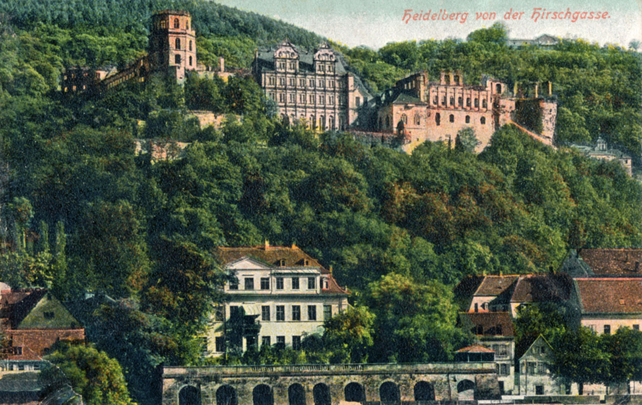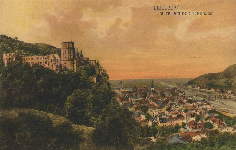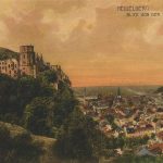 (Heidelberg)…in reizender Gegend des Neckartals, da, wo der Fluß aus dem Gebirge in die Ebene tritt, am Fuß des 566 m hohen Königsstuhls, erstreckt sich am linken Neckarufer zwischen Fluß und Gebirge in einer einzigen Hauptstraße, 3 km lang, von Osten nach Westen.