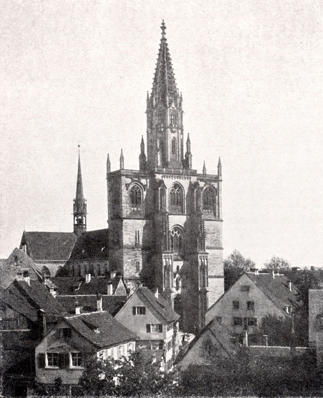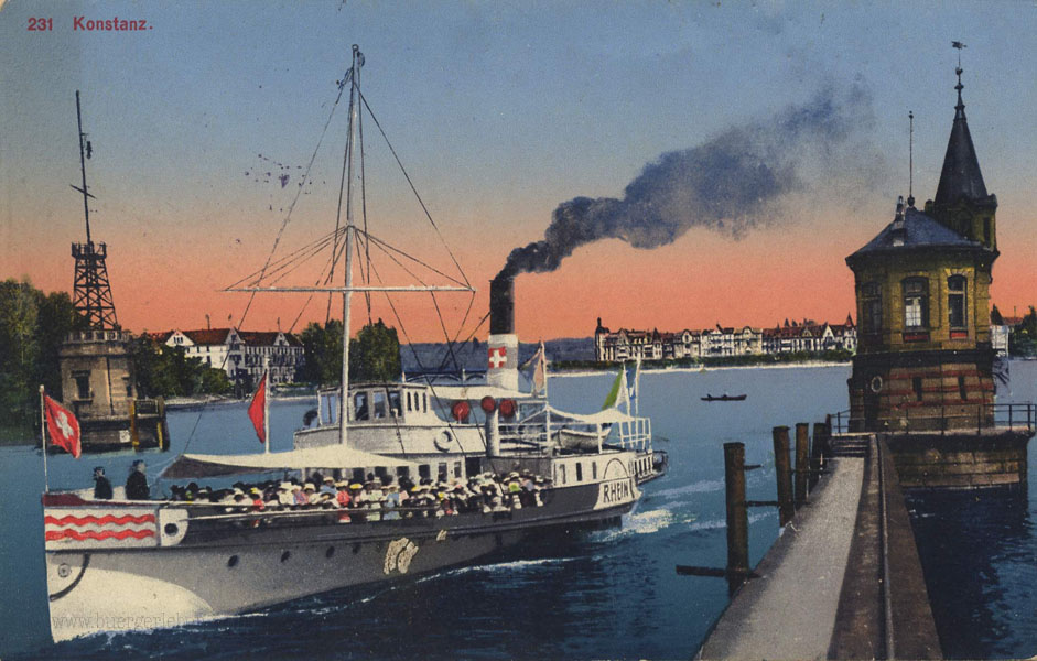 …in anmutiger Lage am Ausfluß des Rheins aus dem Bodensee, 405 m ü. M., besteht außer der Altstadt noch aus dem ehemaligen Kloster, jetzt zu Kasernen umgewandelten Petershausen, den Stadtteilen Seehausen und Paradies, mit zahlreichen Gärten und Gemüsefeldern, auf dem rechten und der Kreuzlinger Vorstadt auf dem linken Rheinufer. Unter den Gebäuden der Stadt ist der Dom, eine 1052–68 erbaute romanische (das Quer schiff ist gotisch) Säulenbasilika, das hervorragendste.