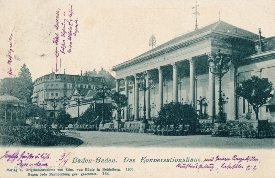 Und Meyers Lexikon sagt: Baden…ist einer der glänzendsten und besuchtesten Badeorte Europas. Obwohl die alte Hauptstadt Badens, ist die Stadt jetzt in ihrem größern Teile eine ganz moderne Anlage, reich an prachtvollen Hotels und in edlem Stil gebauten Villen und Privatwohnungen.