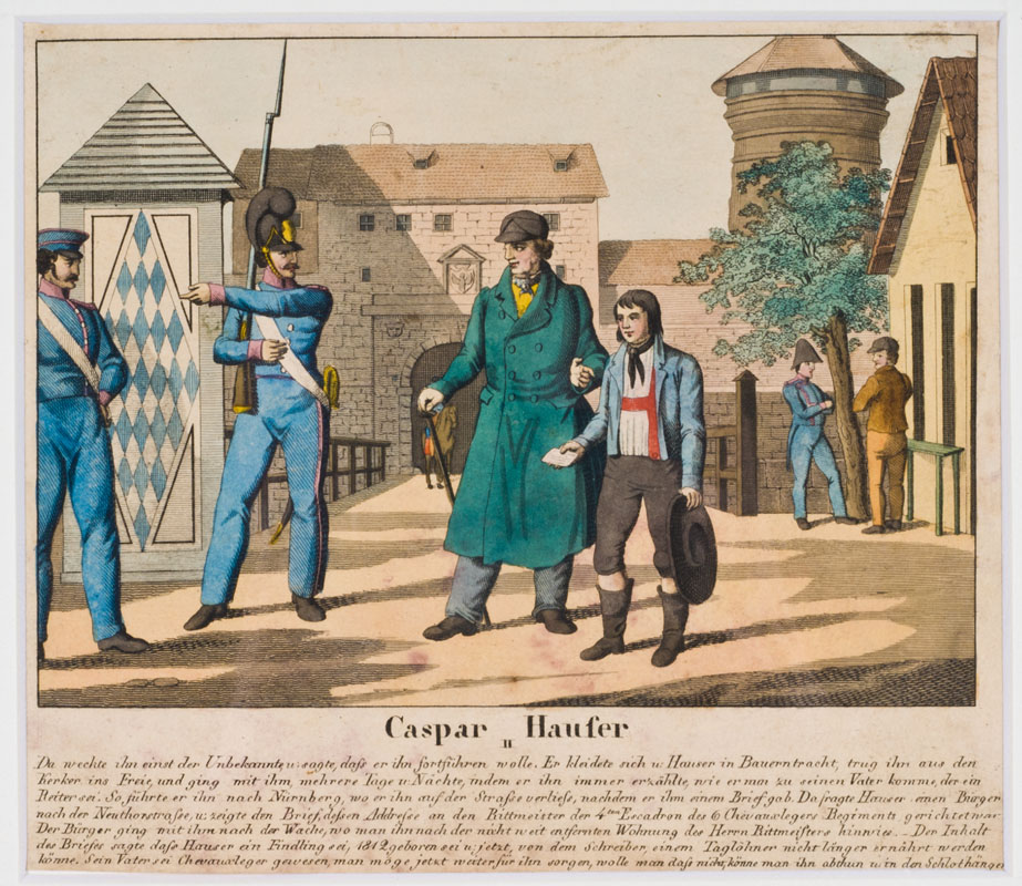 Etliche Jahre später erhielt das Gerücht jedoch wieder neue Nahrung, insbesondere ging es dabei um den Ende September 1812 erstgeborenen Sohn: 1828 tauchte in Nürnberg ein rätselhafter junger Mann mit Namen Kaspar Hauser auf. Seine Sprach- und Schreibkünste waren begrenzt, in einem Begleitbrief schrieb sein Vater, ein Tagelöhner, das Kind wäre ihm 1812 vor die Tür gelegt worden. Er hätte es aufgezogen, aber nicht aus dem Haus gelassen. Schnell wird der Junge zur Sensation – nach seiner Herkunft weiter befragt, erzählt er, dass er in einem lichtlosen Raum in halbliegender Stellung aufgewachsen wäre und erst kurz vor seinem Weggang von einem Unbekannten im Gehen und Schreiben unterrichtet worden wäre – derselbe hätte ihn dann bis vor die Tore Nürnbergs begleitet.