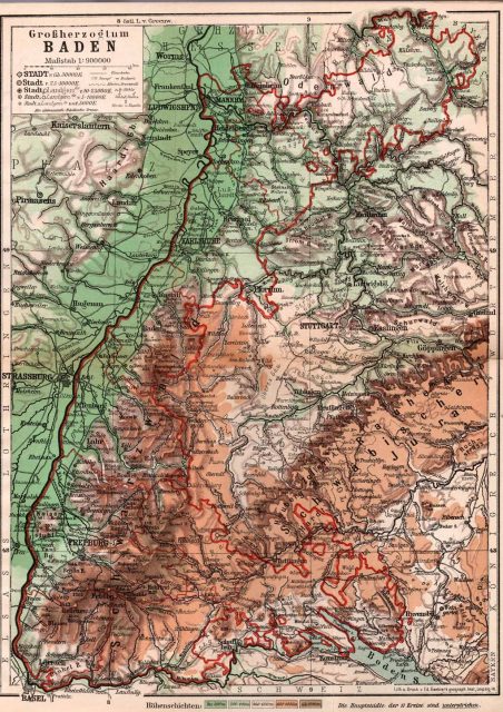Zunächst mal geographisch: Baden gehörte mit Bayern, Württemberg, Hessen und dem damaligen Reichsland Elsaß-Lothringen zu den süddeutschen Staaten. Was die Grenzen und Landschaften angeht, werden diese in der „Landeskunde des Großherzogtum Baden“ von 1911 perfekt zusammengefaßt: