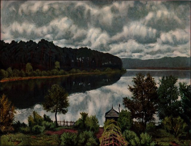 Beim Durchschauen einer Gartenlaube für die kommenden Ausgaben der Rubrik „Was geschah vor 110 Jahren“ stieß ich auf ein Landschaftsbild, was mich spontan ansprach. War es die Stimmung, die Farbigkeit oder der Kontrast zu den anderen „Kunstbeilagen“, die sich im Buch befanden? Die sind nämlich teilweise „schrecklich“ – alte Genreszenen sowie kitschige Kinder- oder auch Tierporträts.