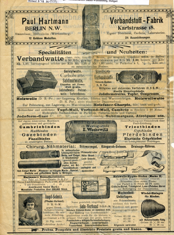 In many letters the three of them discussed how a dressing material would have to be produced in order to be absorbent and sterile. It was definitely a risk for Paul Hartmann to change his production towards this new medical product since it was new for all those involved. With help and support from Lister he was able to develop and produce a dressing material which was sterile, and with Brun’s support, the Hartmann company was the first to produce dressing materials out of cotton that effectively absorbed liquid.