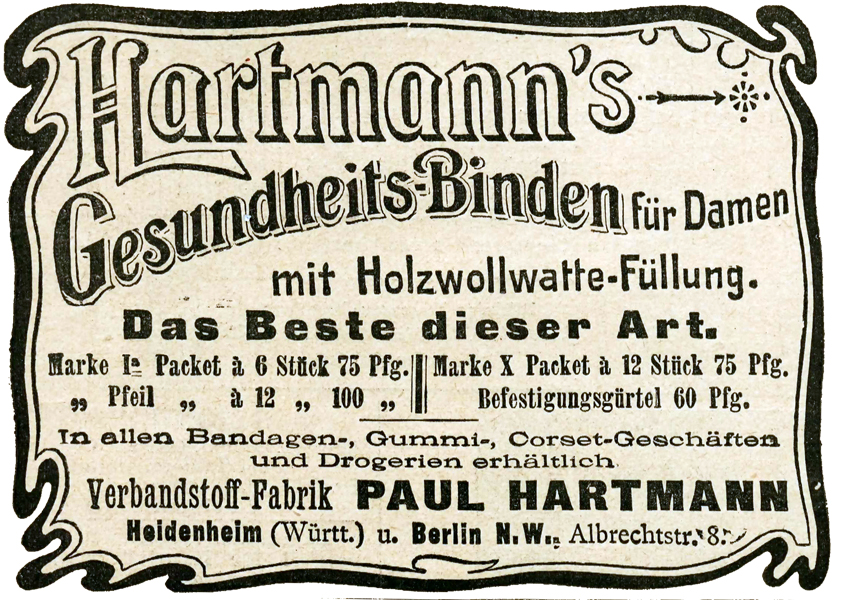 Back to our female product: the demand for dressing and gauze materials didn’t only exist in the medical area, but also in the area of monthly hygiene. This led the Hartmann company to develop single-use sanitary towels for women, made out of gauze and filled with wood-wool, in the last quarter of the 19th century. Later, the wood-wool was replaced with wadding for more expensive pads, but the simpler products (also those of other producers) continued to be filled with wood-wool. The product became a bestseller in England, but naturally there was also a high demand in Germany.
