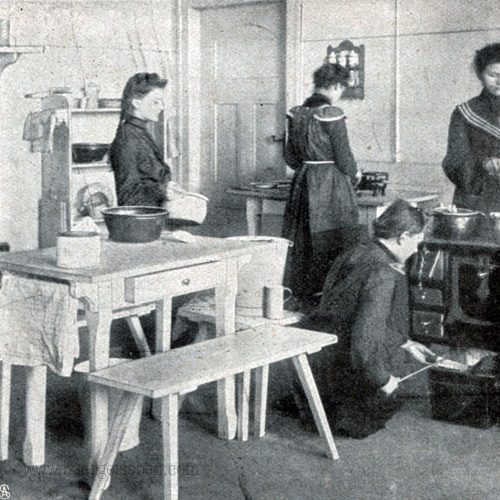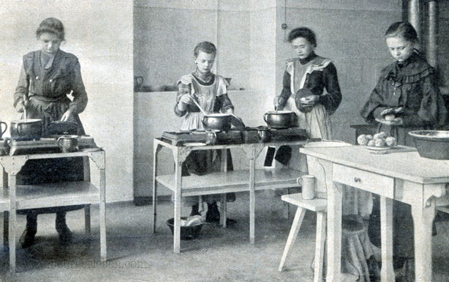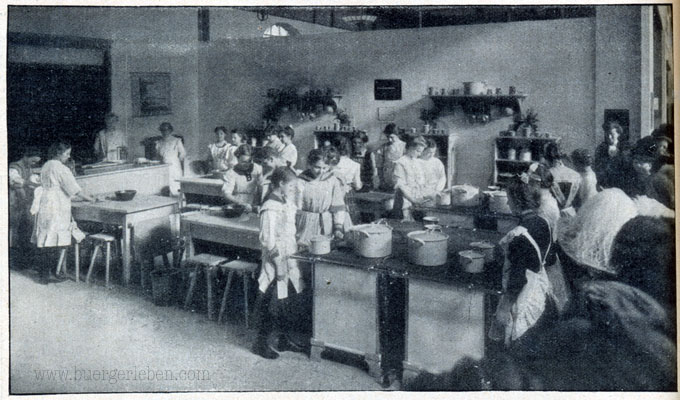 „Die Küche ist in einem großen hellen Saal eingerichtet. Gewöhnlich besteht eine Klasse aus zwanzig Schülerinnen und jede derselben soll sich abwechselnd als Hausmütterchen oder als anderes Familienmitglied fühlen. Darum wird jede Klasse in Familien eingeteilt und zu jeder gehören vier Schülerinnen.“