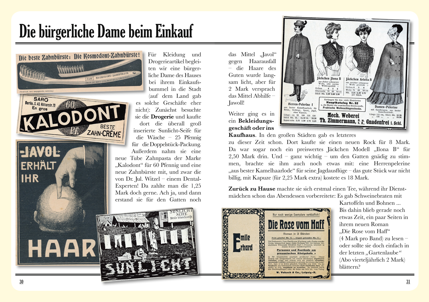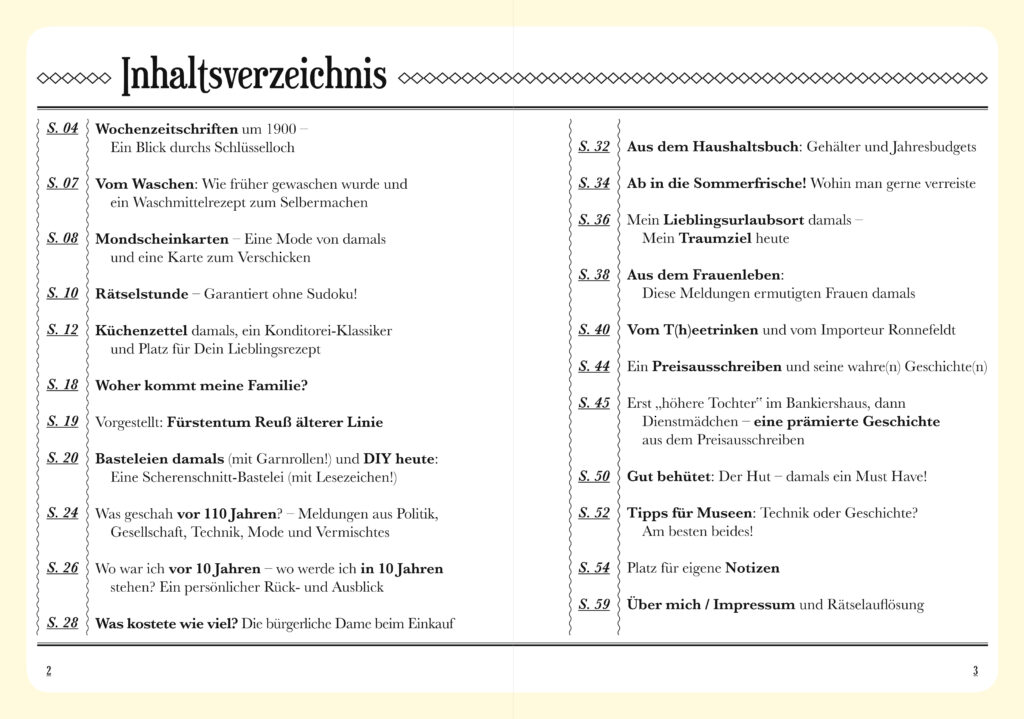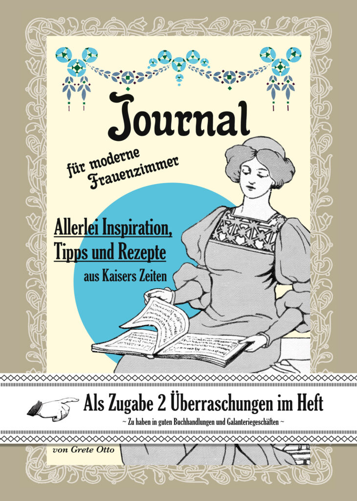 Im Journal (DIN A 5 Format) findet Ihr allerhand Wissenswertes, Lustiges, Praktisches und Innovatives aus der Kaiserzeit. Insbesondere die Frauenzimmer spielen dabei eine tragende Rolle! Änderte sich doch einiges für sie in dieser Zeit – zum Besseren! Trotz allem blieb noch allerhand Handlungsbedarf – bis heute.
