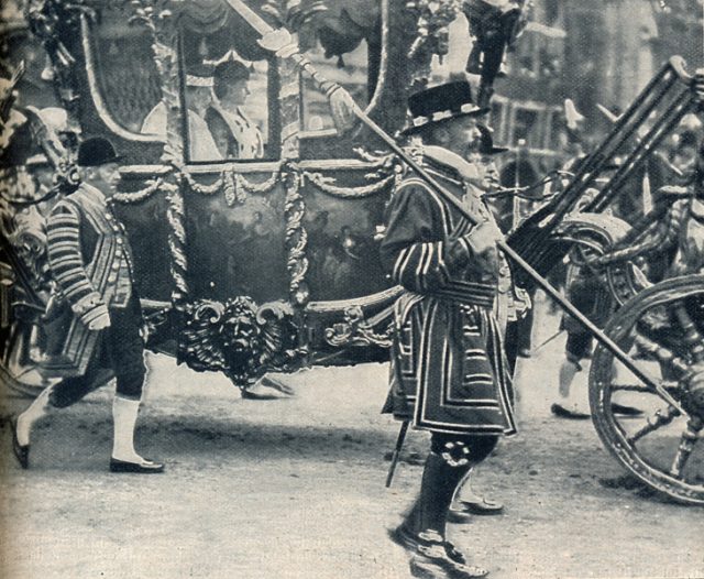 Nach seiner Ernennung im Januar 1901 wurde die Krönung zunächst für den Juni 1902 anberaumt. Allerdings bekam Edward kurz davor eine lebensgefährliche Blinddarmentzündung – die Krönung musste verschoben werden! Am 9. August 1902 fand sie dann schließlich statt. Um den König etwas zu schonen, hatte man die Zeremonie in Westminster Abbey etwas „gestraft“ – trotz alledem dauerte sie noch 2 ½ Stunden. Und hätte fast abgebrochen werden müssen! Und zwar wegen eines drohenden Ohnmachtsanfalls. Nein, weder den König noch die Königin hätte es beinahe erwischt, sondern den ausführenden Erzbischof von Canterbury. Aber am Ende hielt er sich wacker… So erzählt es jedenfalls der Bericht der „Sonntagszeitung für die deutsche Frau“ von 1902, aus dem übrigens alle Originalzitate im Artikel stammen.
