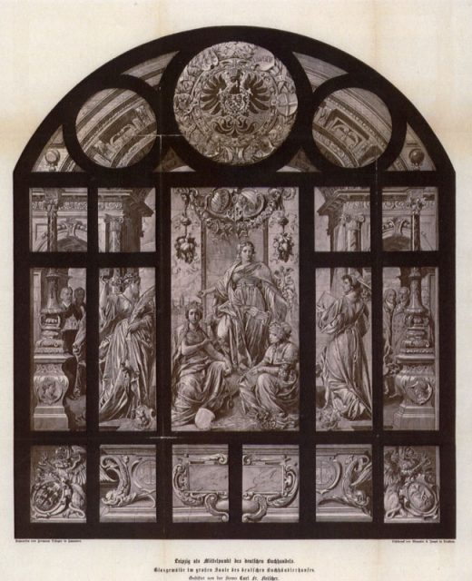 Neobarocke Deckengemälde, in denen Merkur als Gott des Handels eine zentrale Rolle spielte, allegorische Figuren, u.a. auch des Industriezeitalters, und als symbolische Krönung die Glasmalerei mit Leipzig als Mittelpunkt des Buchhandels am Hauptfenster des Festsaals verliehen diesem Innenraum einen weihevollen Charakter. Zeitgenossen zogen Vergleiche zur Pracht des Petersdoms in Rom. Fast alle Männer von Bedeutung, die in Leipzig lebten, waren zur Einweihung 1888 anwesend: der Oberbürgermeister, der Reichsgerichtspräsident, namhafte Professoren der Universität. Als höchster Ehrengast erschien der sächsische König. Bei der Eröffnung des Hauses betonte der damalige Oberbürgermeister Otto Georgi die Bedeutung dieses Wirtschaftszweiges für Leipzig.