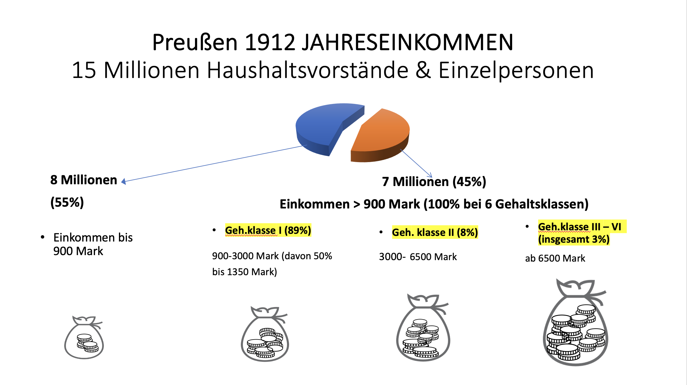 Bei höheren Jahreseinkommen ging es dann auf großbürgerliche Verhältnisse zu, dies betraf (mit weniger als 1% in Preußen) prozentual nur eine sehr geringe Anzahl an Haushaltsvorständen.