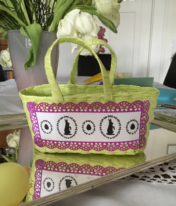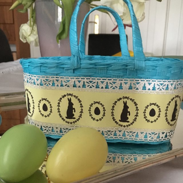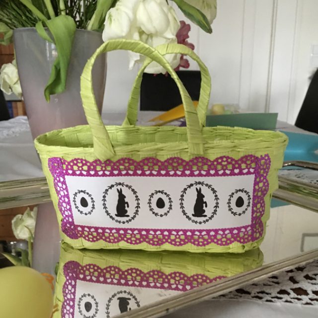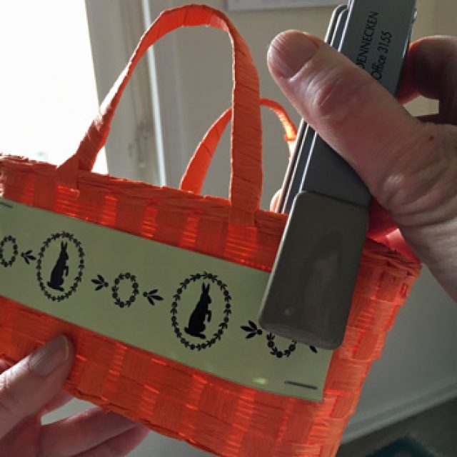 Das Band wird entweder auch wieder mit doppelseitigem Klebeband (was dünn geschnitten auf das Band platziert wird) oder mit Bastelkleber (Achtung – das ist etwas für geschickte Bastler, da der Kleber nicht auf das Papier laufen sollte) aufgebracht, so daß es ca. hälftig auf Papier und Korb aufliegt. Fertig!
