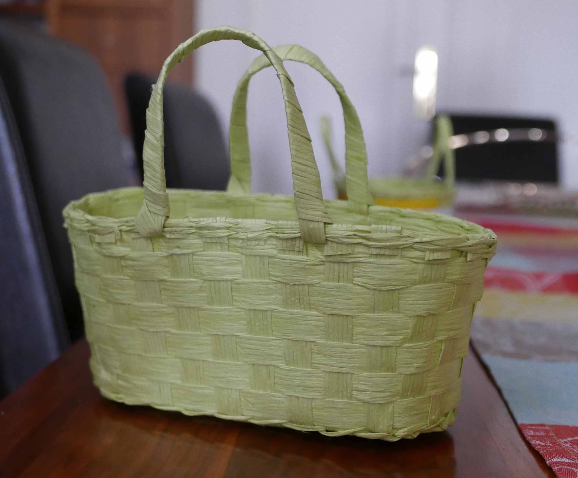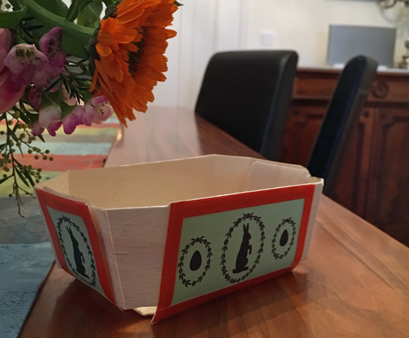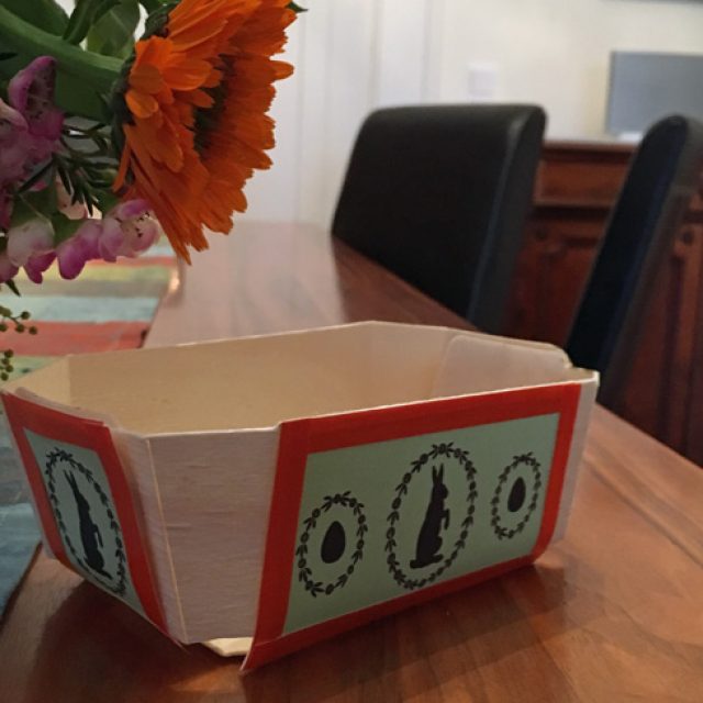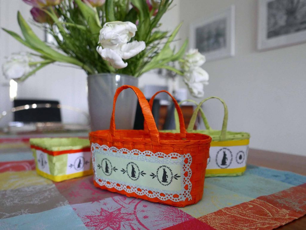 Es geht auch mit Einzelornamenten auf viereckigen Körbchen sowie Obstkörbchen aus Span aus dem Supermarkt.
