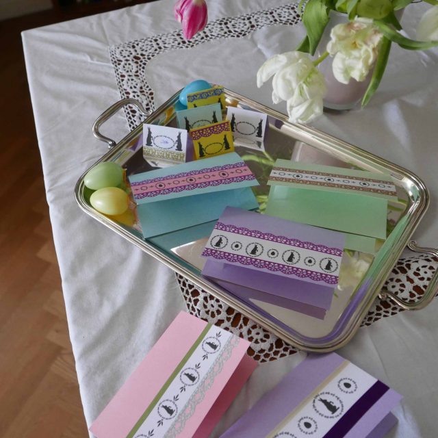 Aber zurück zu unserem Kartenprojekt als Anlaß zum Selberschreiben – oder natürlich zum Verschenken – hier die Anleitung für hübsche Osterkarten mit nostalgischen Motiven: