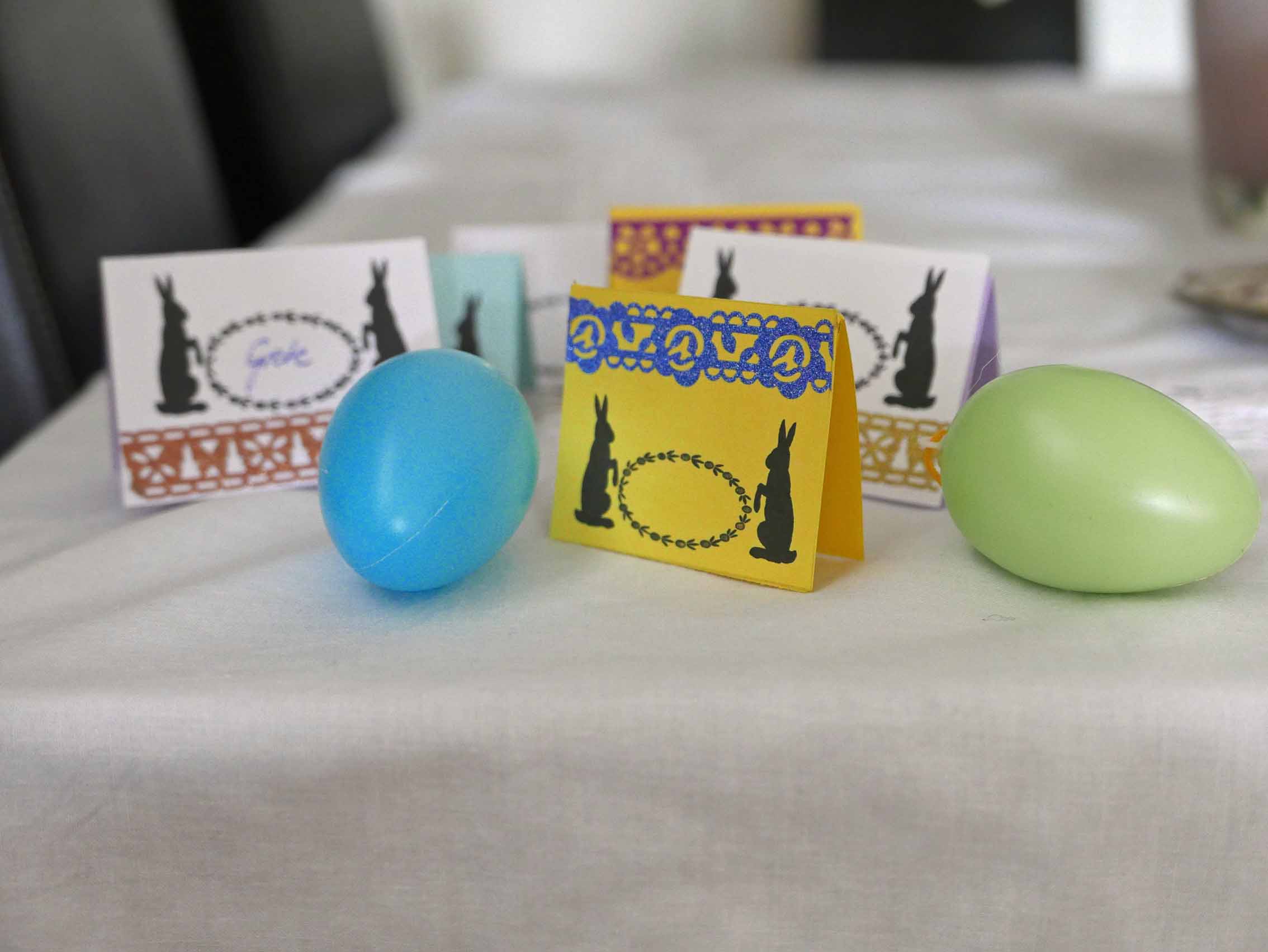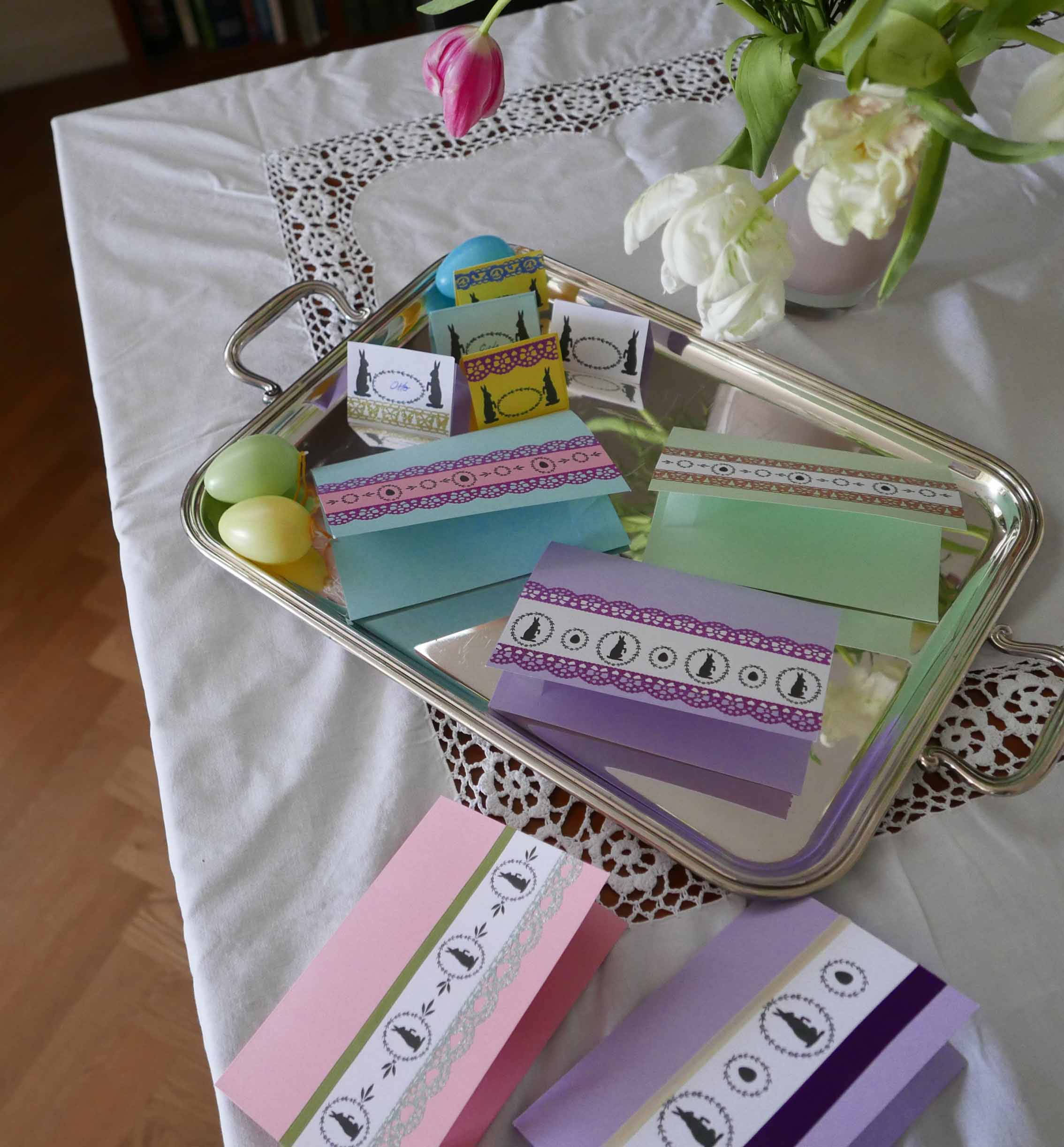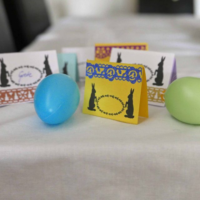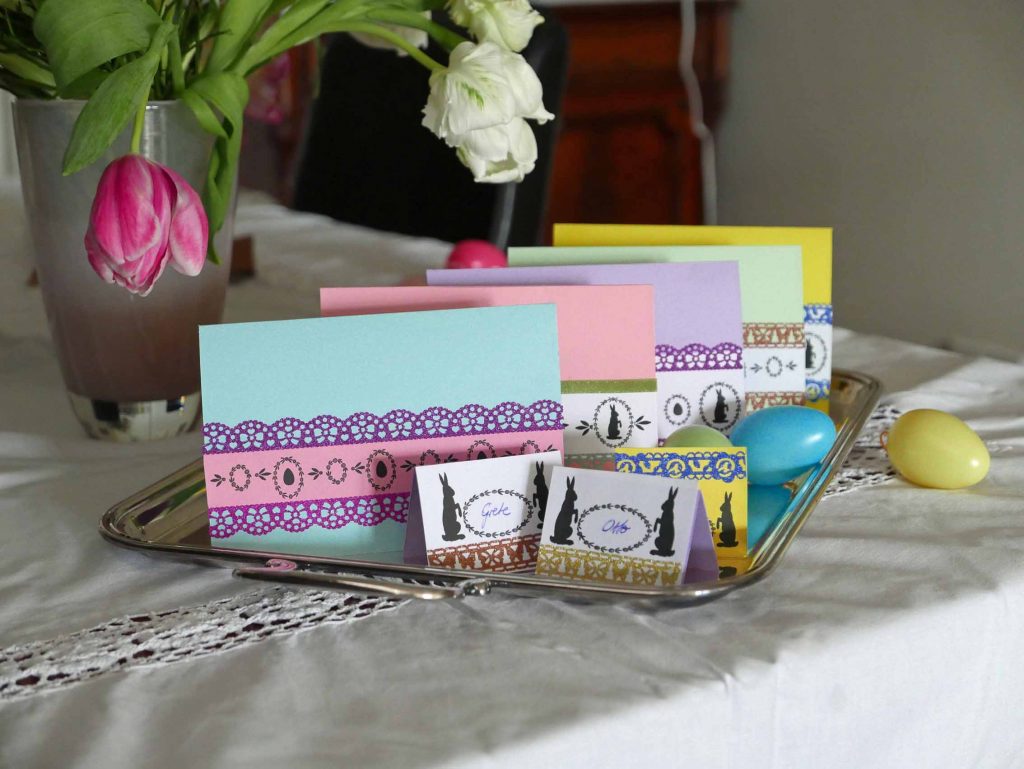 Mit den gleichen Materialien lassen sich auch hübsche Tischkärtchen für das Osterfest basteln – es ist schließlich oft ein Anlaß, daß die Familie zusammenkommt und am festlich gedeckten Tisch tafelt – auch wenn wahrscheinlich kein Hasenbraten auf den Tisch kommt. Falls Ihr eine Idee für eine Vorsuppe benötigt – hier wäre ein Rezept dazu.