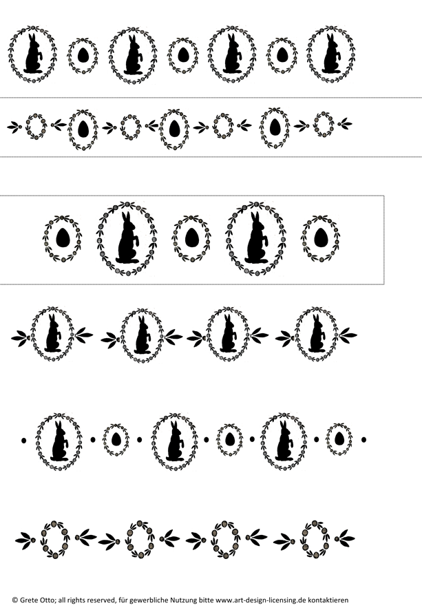 Wir drucken das pdf entweder auf weißem, farbigen oder Aufkleberpapier aus. Die verschiedenen Dekore sind für die Karten im angegebenen Format ausgelegt. Wir ziehen die Bleistiftlinien oben und unten je nach gewähltem Ausschnitt mit etwas mehr oder weniger „weiß“ und schneiden sie auf die Breite 17 cm und die gewünschte Höhe zu. Bei zwei Mustern sind oben und unten schon Linien vorgegeben.