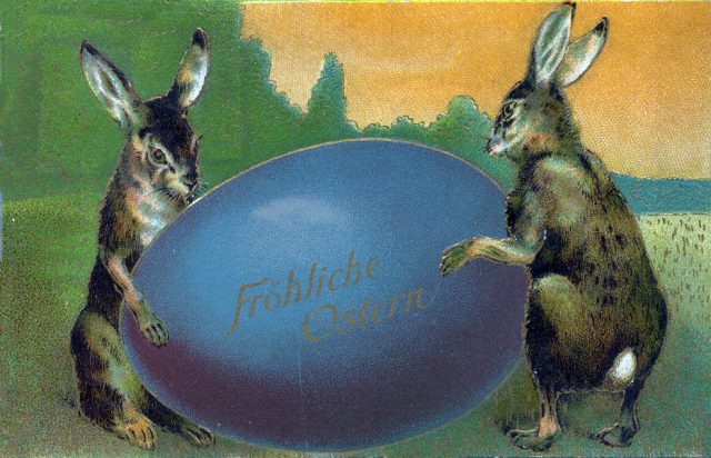 Der Hase war –da besonders fruchtbar- gleichfalls ein Symbol für Fruchtbarkeit und (zum letzten Mal) kommt die Frühlingsgöttin Ostara ins Spiel – im heidnischen Glauben war ihr der Hase als heiliges Tier zugeordnet. Als Überbringer der Ostereier ist er aber erst seit dem 17. Jahrhundert überliefert. In ländlichen Gegenden (in denen sich die Kinder gut in der Natur auskannten) wurden die Eier übrigens noch eine längere Zeit vom Storch oder Kuckuck gebracht, sozusagen nach ihrer Rückkehr aus dem Süden – bis sich der Osterhase als Eierbringer schließlich durchsetzte.