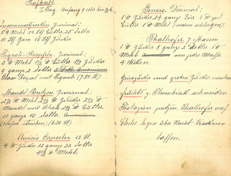 In dem von Otto Desbalmes handschriftlich verfassten Kochbuch finden sich zahlreiche Rezepte, die mit I.M.gekennzeichnet wurden. Ihre Bestimmung war damit klar – es handelte sich um Rezepte für Kaiserin Elisabeth. Neben zahlreichen Rezepten für Mehlspeisen sind in dieser Sammlung auch Rezepte für kleines Backwerk und Konfekt enthalten. Manchen Mitgliedern des Kaiserhauses wurden Rezepte gewidmet: Man findet u.a. Gisela Brätzen [sic], Stroh Bretzen Erzherzogin Gisela, Zucker Teig Erzherzog Franz Karl etc. Auch von Hofzuckerbäcker Seitz übernahm Desbalmes Rezepte, war Seitz doch der Lieblingszuckerbäcker von Kaiserin Elisabeth. Soufflée Territet, Meraner und andere Speisen weisen auf die Reisen der Kaiserin hin, von denen sie Rezepte mitbrachte. Darüber hinaus finden sich Rezepte für Englische Cakes von Ida Ferenczy, die natürlich auch Rezepte für ihre Herrin sammelte. Gertrud Festetics, eine Nachfahrin von Sisis Hofdame Marie Festetics, stellte der Autorin drei Originalrezepte zur Verfügung: Sisi-Taler, Energiekekse und Dinkelweckerln.