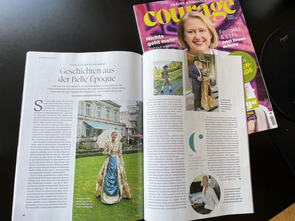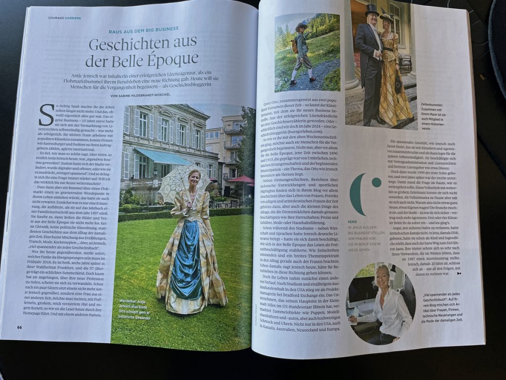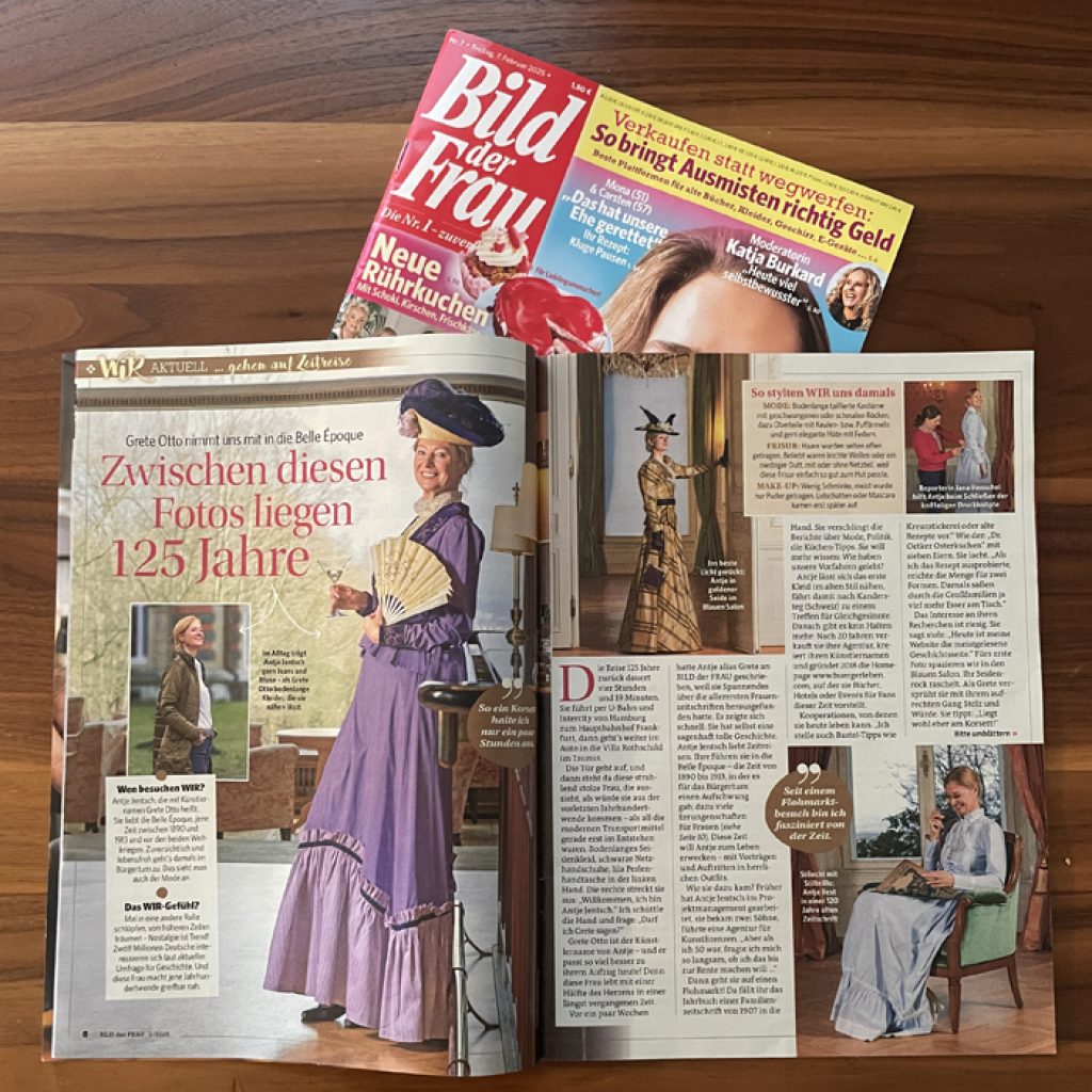 Im Artikel mit der Redakteurin Jana Henschel erzähle ich, wie ich zu meiner Begeisterung für die „Belle Époque“ kam und einiges über das damalige Frauenleben und wie es in den Frauenzeitschriften abgebildet wurde. Das Fotoshooting dazu fand im Hotel „Villa Rothschild“ statt.