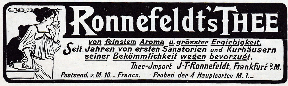 „Vorzüge, die in rasch wachsendem Maße Ronnefeld’s Thee in allen Gesellschaftskreisen, in Sanatorien und Krankenhäusern, in den Kurhäusern der besuchtesten Bäder des In- und Auslandes, in Theeküchen von Fabrikbetrieben usw. zur Einführung bringen und den verwöhnten Kenner ebenso wie den Laien aus einfachen Kreise, zum treuen Kunden zu gewinnen:“