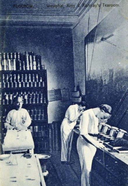 Zu den wichtigen Tee-Importeuren hatte man enge Verbindungen, so auch zur 1796 in Hamburg gegründeten Firma „G.W.A. Westphal & Sohn“. Dieses Bündnis wurde durch familiäre Bande gestärkt – Emma Ronnefeldt, eine Tochter von Carl Rudolf (für alle ganz genauen: dessen Vater war Carl Adolf) und seiner Frau Emmy, hatte einen Sohn der Westphal-Familie geheiratet. Emma selbst stammte gleichfalls aus einer bekannten Unternehmer-Familie: sie war die Tochter des Degussa Gründers Heinrich Roessler. Das Ehepaar lebte in Shanghai und dort kam 1922 Sohn Herwarth Westphal zur Welt. Er sollte in den 60er Jahren dann Mitinhaber der Firma werden. Die Städte Shanghai und Hankow waren zu dieser Zeit die wichtigsten Handelszentren für Tee, im Bild ein Blick in einen damaligen Teeverkostungsraum.