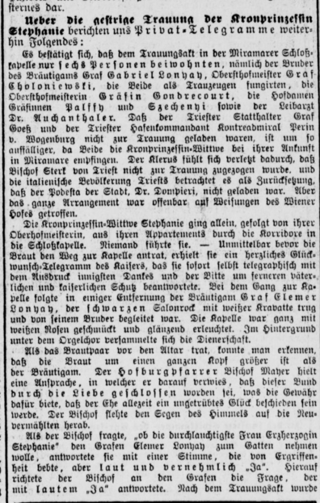 Als Stephanie ihre Tage bekam, war sie 16 Jahre alt und die Hochzeit wurde für den 10. Mai 1881 in Wien geplant. Auf die Trauung folgten die Flitterwochen im Schloss Laxenburg, unweit von Wien gelegen.