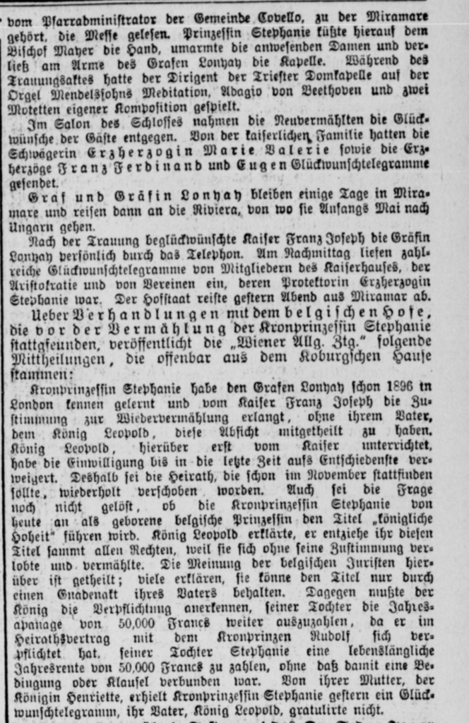 Zeitungsartikel über die 2. Hochzeit von Stephanie aus dem „Berliner Tageblatt“ vom 23. März 1900 (Quelle: ZEFYS)