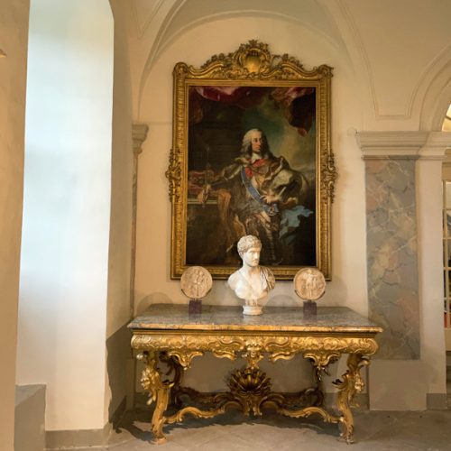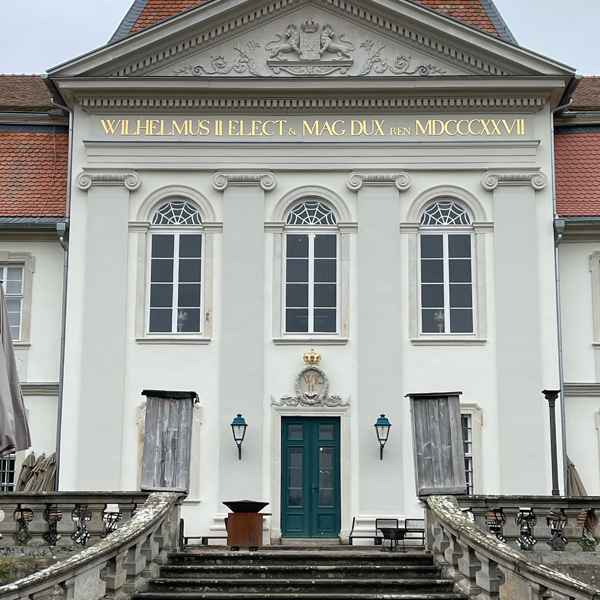 Ich war bei einer Winterführung dabei und erfuhr viel Wissenswertes zur Geschichte des Schlosses, welches in seiner jetzigen Form ca. 1740 vom Fürstbischof von Fulda, Amand von Buseck als Sommerresidenz ausgebaut wurde. Im Winter wurde das Schloss nie genutzt, ich verstehe auch warum, denn es war recht kalt – also Winterjacke anlassen! Die vorhandenen Öfen sind Attrappen, erzählt uns die Gästeführerin dazu und auch viel Wissenswertes über das Adelsleben. Z.B. zur sogenannten Kaisertreppe, die in den 1. und repräsentativen Stock führt. Der Rang des Gastes bestimmte, wieviele Treppenstufen ihm der Gastgeber entgegenkam (oder auch nicht…).