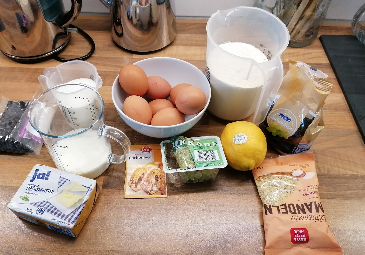 Zuerst mal alles hinstellen, damit man auch nichts vergisst. War extra noch eine unbehandelte Zitrone kaufen. Hier noch ein kleiner Tipp von mir. Wer Zitronat nicht mag, der könnte es mal mit Quittebrot probieren. Semmelbrösel brauch ich nicht da ich voll auf Silikon-Backformen stehe, die braucht man nicht einfetten. Hat allerdings auch den Nachteil, dass die Mandeln nicht an der Außenwand halten, deshalb lassen wir die weg. Die Mandeln sind meiner Meinung nach nur Deko. Wenn man mal an das Osterbrot vom Bäcker denkt, da sind meistens geraspelte Mandeln auf der Außenseite. Damit die am Teig halten, werden sie in die eingefettete Form gestreut und mit gebacken.