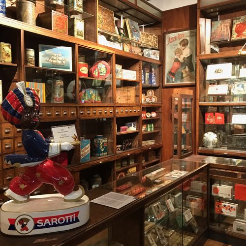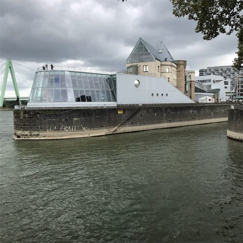 In den oberen Etagen wird dann auch die Geschichte der Schokolade erzählt – mit vielen schönen Exponaten. Zu sehen sind z.B. zwei original eingerichtete Läden mit ganz vielen historischen Verpackungen für Schokolade, Kakao und Pralinen – aus unterschiedlichen Materialien und oft aufwendig verziert! Oder eine Sammlung von Schokoladen-Automaten, die Anfang des 20. Jahrhunderts sehr populär waren – dort konnte man sich -gegen Einwurf von Münzen- Schokoladentafeln ziehen. Aus der Zeit davor, in der vorwiegend Adlige Schokolade genossen, sind sehr schöne historische Services zu bewundern, damals ausschließlich für den Genuss von Kakao gedacht. Das macht Appetit auf heiße Schokolade! Im Café des Museums genieße ich eine – mit herrlichem Blick auf den Rhein.