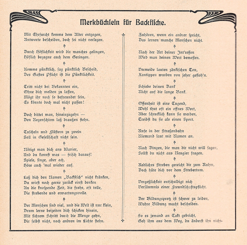 Was ist der Inhalt von Backfischbüchern? „Frauenleben“, eine in Wien erscheinende Zeitschrift für die Interessen der Lehrerinnen und Erzieherinnen, hat im Jahre 1902 „Mädchen-Bücher“ folgendermaßen beschrieben: