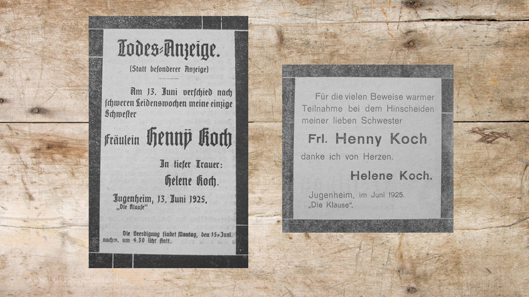 Henny Koch ist 70jährig am Samstag, 13. Juni 1925 in Jugenheim gestorben. Im Nachruf von Helene Christaller kann man lesen: